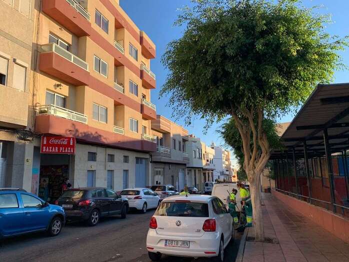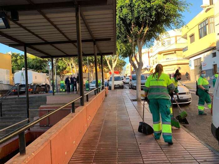 Durante esta jornada, 18 personas (tres conductores y quince operarios) actuaron en este barrio teldense para ejecutar las tareas de limpieza con ayuda de una cuba de baldeo de 9.000 litros, una barredora dulevo, un camión voluminoso de 5.000 kilos y dos vehículos más.