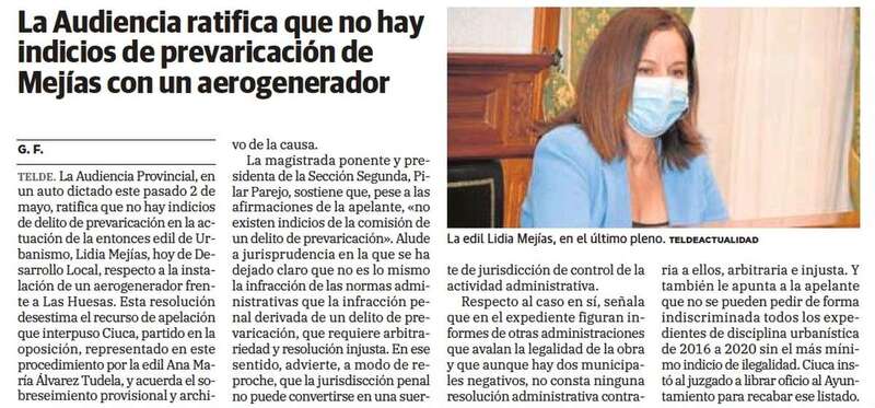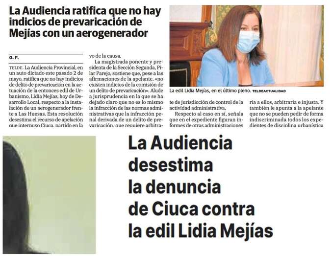 La noticia avanzada el pasado 5 de mayo por TELDEACTUALIDAD sobre el varapalo judicial de la Audiencia Provincial de Las Palmas a Ciuca al desestimar su querella contra la concejala del Gobierno de Telde, Lidia Mejías, por la comisión presunta de prevaricación por omisión en el expediente del aerogenerador de Salinetas ha tenido una amplia repercusión en la prensa impresa canaria.