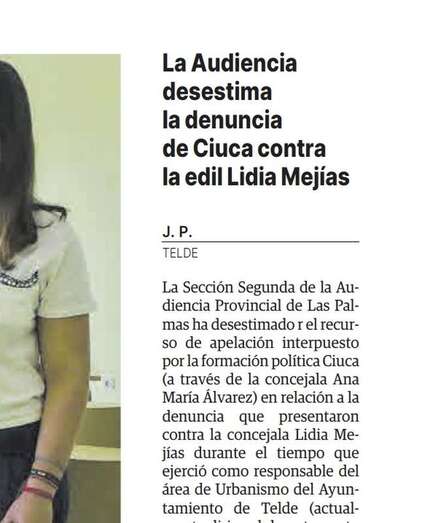 La Audiencia desestima la denuncia de Ciuca con la edil Mejías se resalta en el encabezamiento de la noticia de LP-DLP que ocupa hoy la columna de salida de la página dedicada a la información de Telde.
