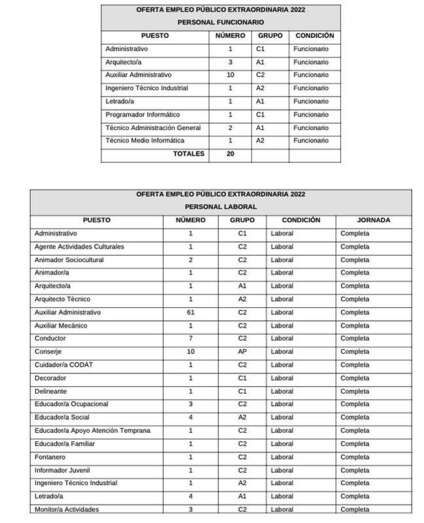 En relación al personal laboral, se convoca 1 Administrativo (C1), 1 Agente de Actividades Culturales (C2), 2 Animadores Socioculturales (C2), 1 Animador/a (C2), 1 Arquitecto (A1), 1 Arquitecto Técnico (A2), 61 Auxiliares Administrativos (C2), 1 Auxiliar Mecánico (C2), 7 Conductores (C2), 10 Conserje (AP), 1 Cuidadora/a CODAT (C2), 1 Decorador (C1) y 1 Delineante (C1).