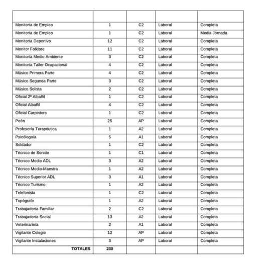 Por último, a ellos se suma 1 Profesor/a Terapéutica (A2), 5 Psicólogo/a (A1), 1 Soldador (C2), 1 Técnico de Sonido (C1), 3 Técnico Medio ADL (A2), 1 Técnico Medio-Maestra (A2), 3 Técnico Superior ADL (A1), 1 Técnico Turismo (A2), 1 Telefonista (C2), 1 Topógrafo (A2), 2 Trabajador/a Familiar (C2), 13 Trabajador/a Social (A2), 2 Veterinario/a (A1), 12 Vigilante Colegio (AP) y 3 Vigilante Instalaciones (AP).