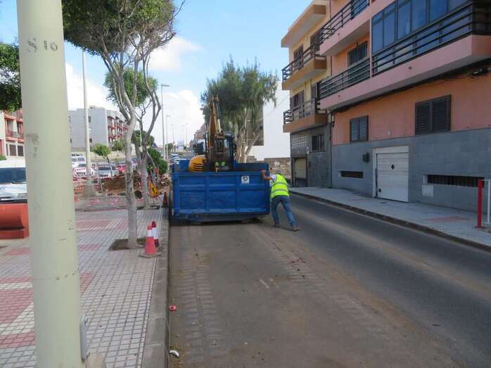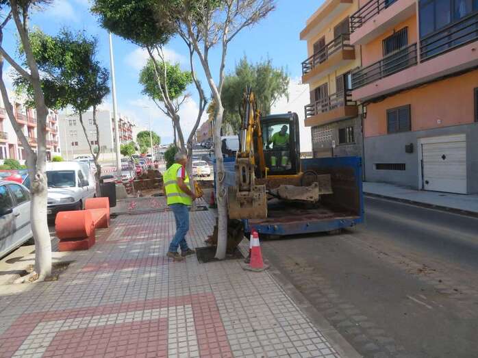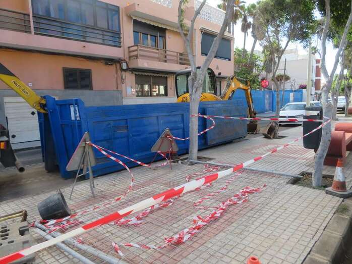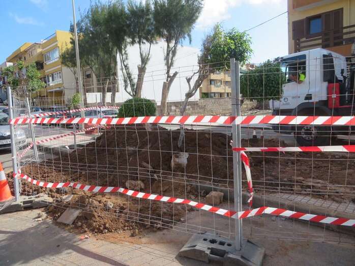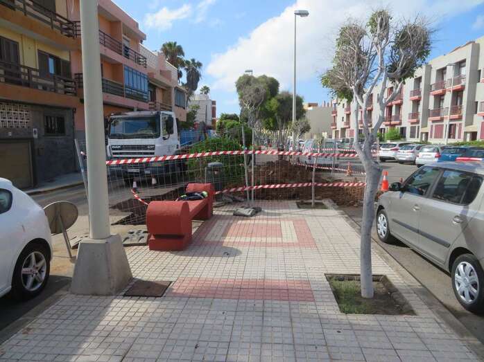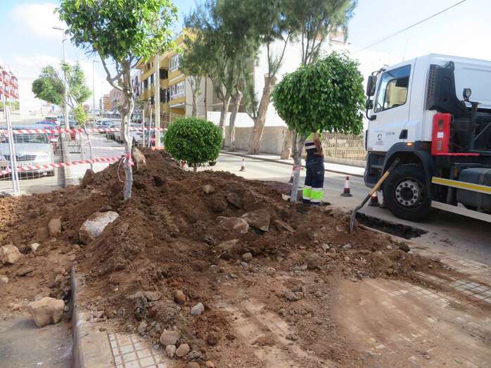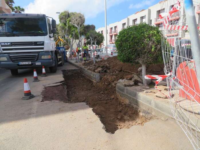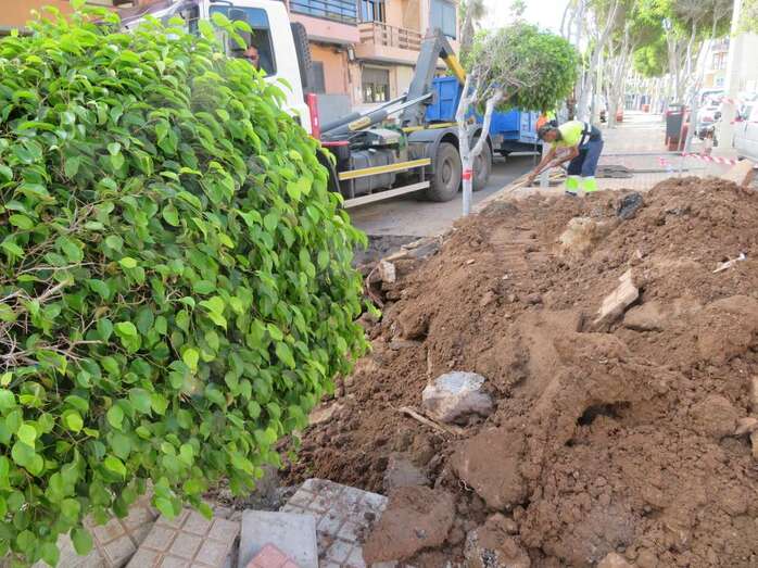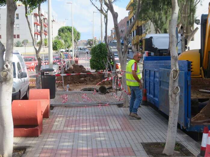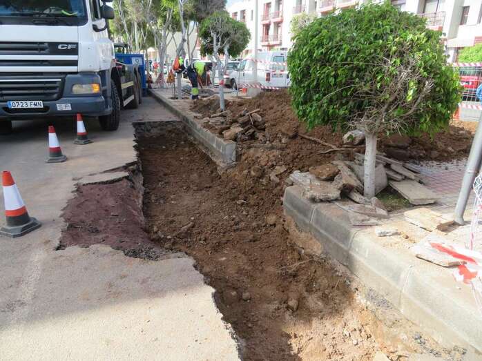 El agrietamiento tuvo lugar en el punto donde la conducción cruza la rambla peatonal de esta calle, por lo que hubo que picar en ella y en el lateral de la vía hasta alcanzar la tubería para su arreglo, una tarea que requirió el concurso de una pequeña excavadora.