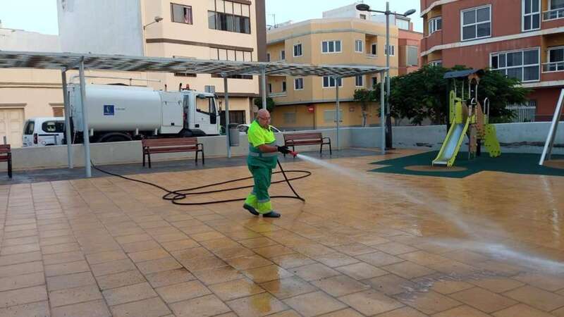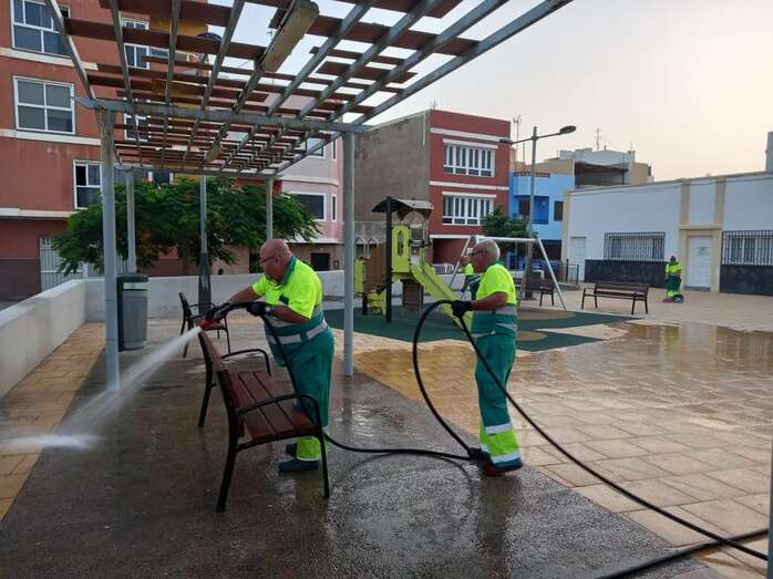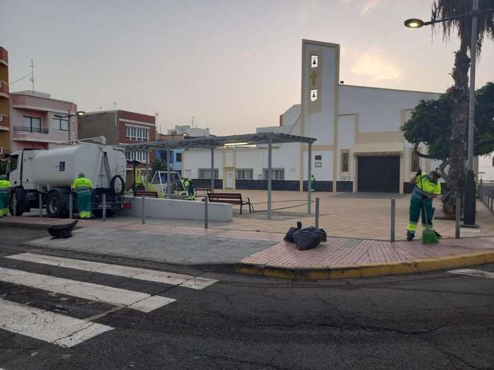 El Ayuntamiento de Telde realizó este martes una limpieza de choque en los barrios de Salinetas y Clavellinas con un dispositivo especial conformado por casi una treintena de personas entre operarios y conductores para adecentar la plaza, además de calles, aceras y el paseo marítimo.
