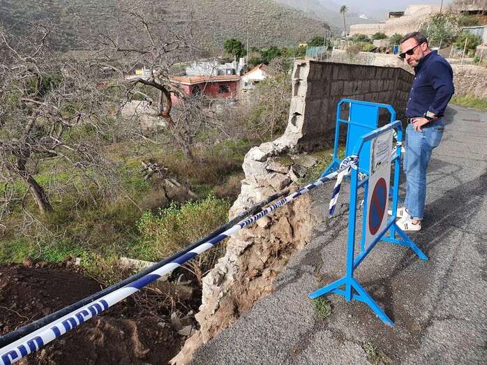 El concejal de Vías y Obras, Eloy Santana, comprobó este miércoles el avance de las labores, que consisten en el arreglo del socavón con hormigón para poder reabrir esta carretera, que fue cerrada al tráfico por el riesgo que supone transitar por la vía al haber cedido un tramo del pavimento.