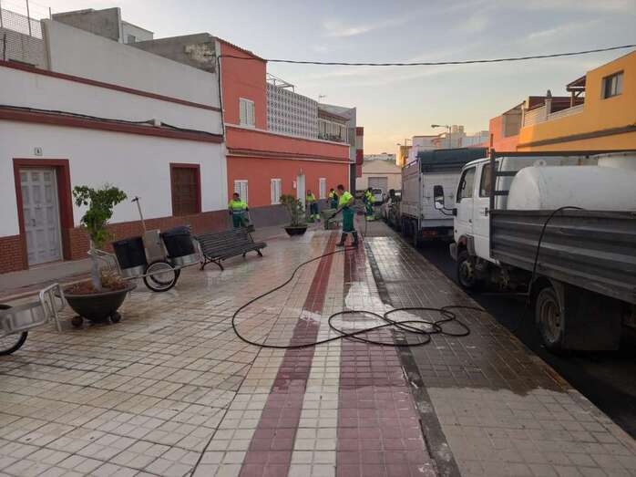 En estas labores, que se ejecutaron también en el sector de Las Tapias, se destinó un dispositivo especial formado por una treintena de personas, entre conductores y operarios y operarias de barrido, alcanzando un área de 90.000 metros cuadrados. En concreto, las tareas consistieron en el barrido manual y mecánico, deshierbe, recogida de trastos y enseres, además del baldeo y la hidrolimpieza del mobiliario urbano, zonas de contenerización y papeleras.