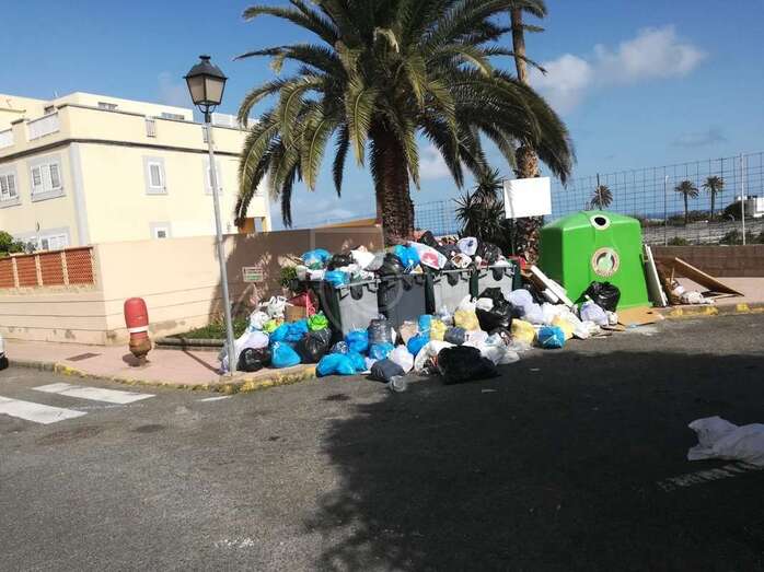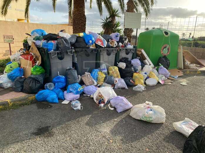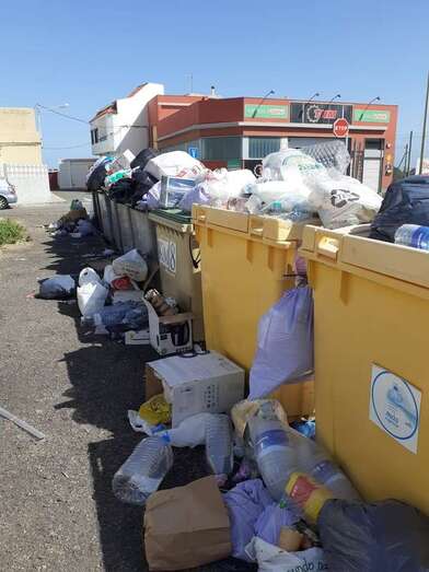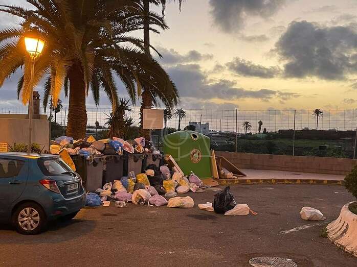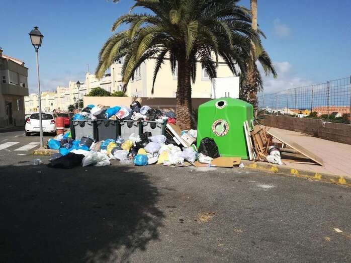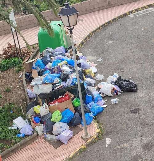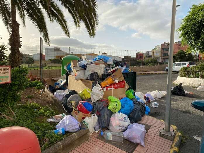 La basura se ha amontonado este jueves en varios puntos de recogida de la ciudad de Telde debido a que los operarios del servicio de limpieza y de recogida de residuos han librado en esta jornada con motivo de la festividad de su patrón, San Martín de Porres.