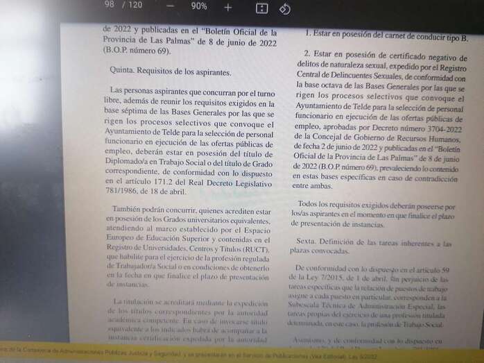 En concreto, precisan que este punto de las bases específica claramente que “las personas aspirantes que concurran por el turno libre, además de reunir los requisitos exigidos en la base séptima de las Bases Generales por las que se rigen los procesos selectivos que convoque el Ayuntamiento de Telde para la selección de personal funcionario en ejecución de las ofertas públicas de empleo, deberán estar en posesión del título de Diplomado en Trabajo Social o del título de Grado correspondiente, de conformidad con lo dispuesto en el artículo 171.2 del Real Decreto Legislativo 781/1986, de 18 de abril”, como se puede comprobar en el documento anexo que TELDEACTUALIDAD ofrece a sus lectores.
