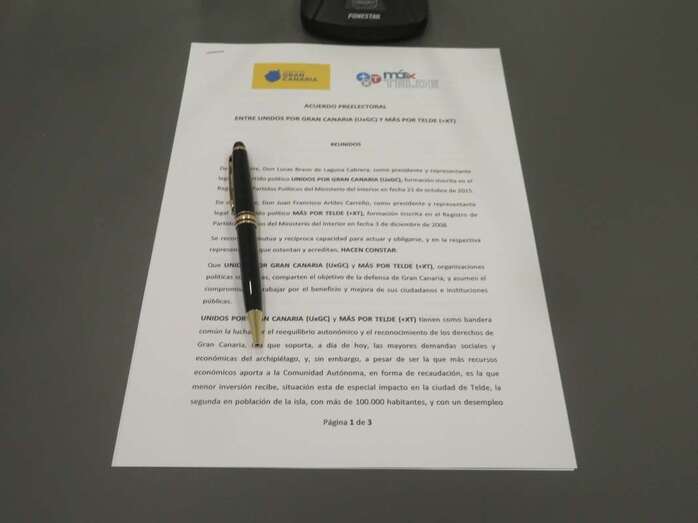 La presentación de este acuerdo preelectoral ante los medios de comunicación tuvo lugar este viernes en Las Palmas de Gran Canaria, en la sede de la formación insular. En una comparencia en la que intervinieron por parte de Unidos por Gran Canaria su presidente Lucas Bravo de Laguna y Juan Francisco Artiles, en calidad de máximo dirigente de Más por Telde. Al acto de la rúbrica del pacto asistieron por UxGC el candidato al Cabildo de Gran Canaria, José María Ponce, exalcalde de Arucas y piloto de rallys. Y por parte de Más por Telde, Mario Torres.
