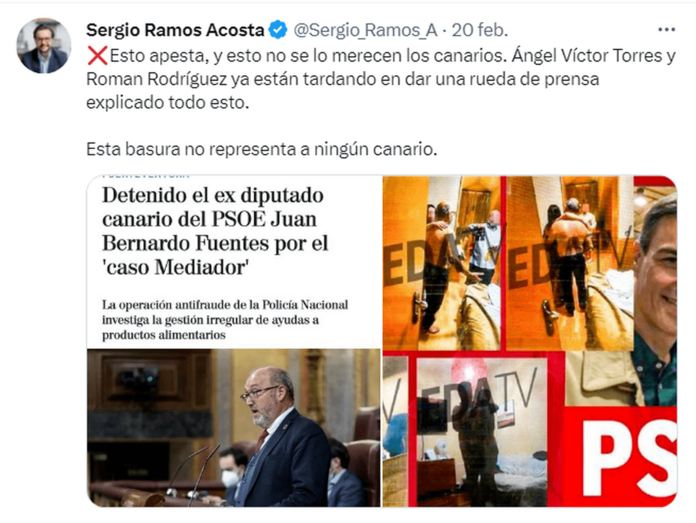 Se manifiesta así tras las acusaciones de que ha sido objeto por el PP y su candidato, Sergio Ramos, a raíz del supuesto caso de corrupción Mediador, en el que se han visto implicados cargos socialistas del Gobierno Canario. Los populares han instado a Ramos a dar explicacione sobre esta investigación policial.