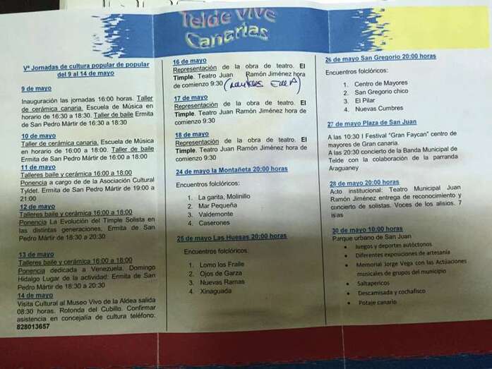 El programa, en papel fotocopiado –debe ser por lo de la crisis– tiene tal número de errores tipográficos, ortográficos y de los topónimos del municipio que a quien lo hizo habría que darle urgentemente un cursillo acelerado, como mínimo, sobre la  correcta nomenclatura de los núcleos de población de Telde.