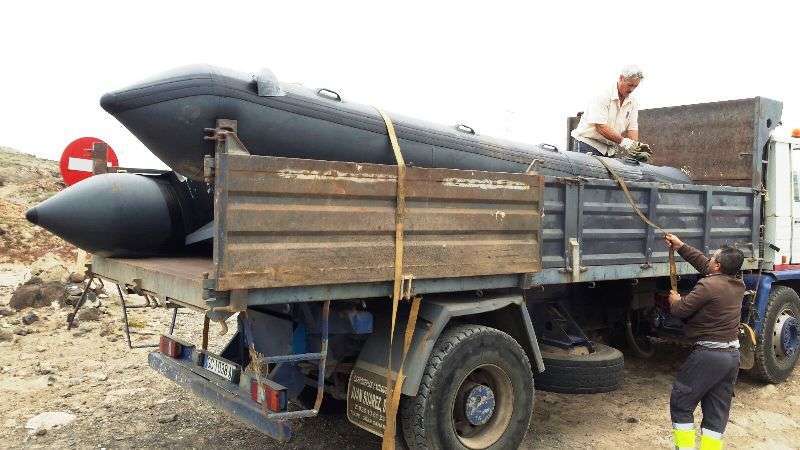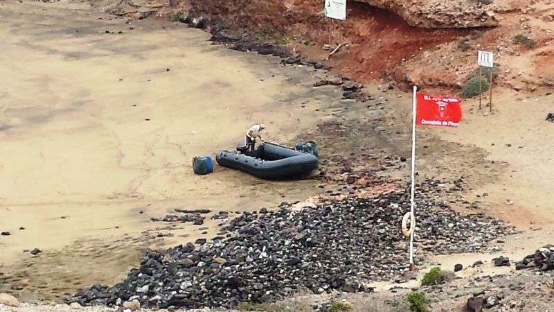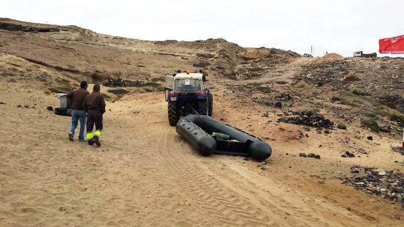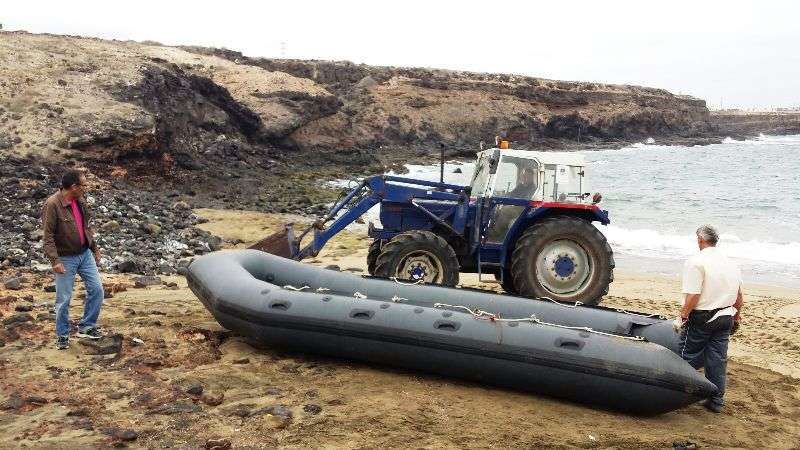El hallazgo se produjo a primera hora de la mañana de este miércoles en la mentada cala de arenas rubias de la parte Sur de la costa teldense. La zodiac de color gris y unos tres metros de eslora estaba varada y abandonada sobre la arena.