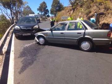 Telde.- Choque frontal entre dos vehículos en la GC-41, la carretera que comunica el casco de Telde con el vecino municipio de Valsequillo. El incidente, que ocurrió hace unos minutos a la altura de Montaña Las Palmas, se saldó con un herido leve.