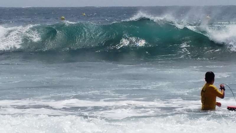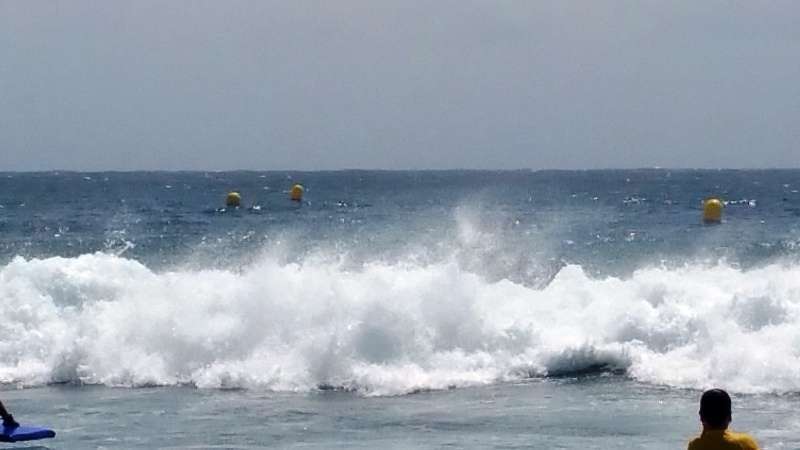 Telde.- Un hombre que se encontraba en apuros fue rescatado al poco antes del mediodía de este miércoles del mar de Salinetas por un socorrista del servicio de vigilancia qaue presta la empresa Proactiva y monitores del curso de Surf que se imparte en esta cala teldense, que registra estos días un fuerte oleaje y corrientes. TA ofrece video e imágenes del estado del mar.