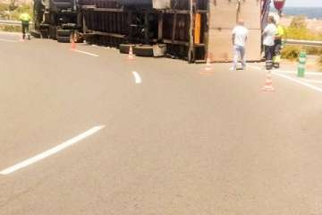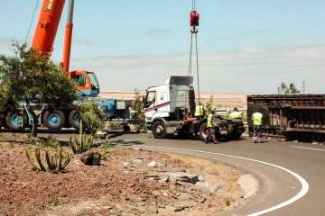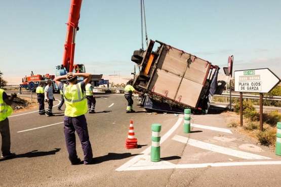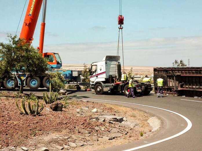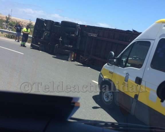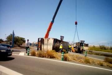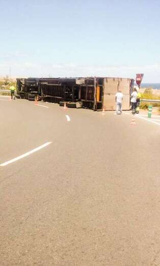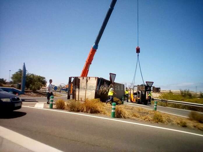 Telde.- Un camión tipo trailer de 11 toneladas de peso volcó a primera hora de esta tarde en las inmediaciones de la Base Aérea de Gando, en la rotonda ubicada en el puente que atraviesa la GC-1 y que da acceso a este recinto militar y a la playa de Ojos de Garza.