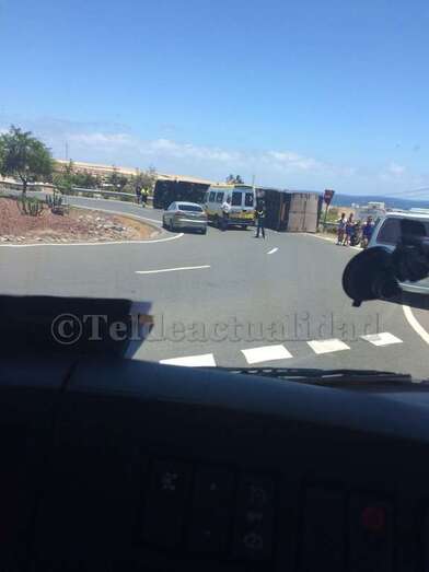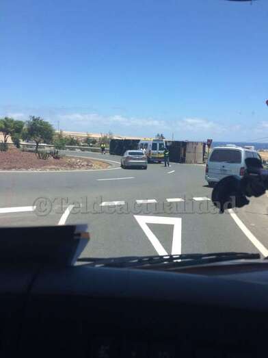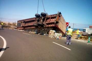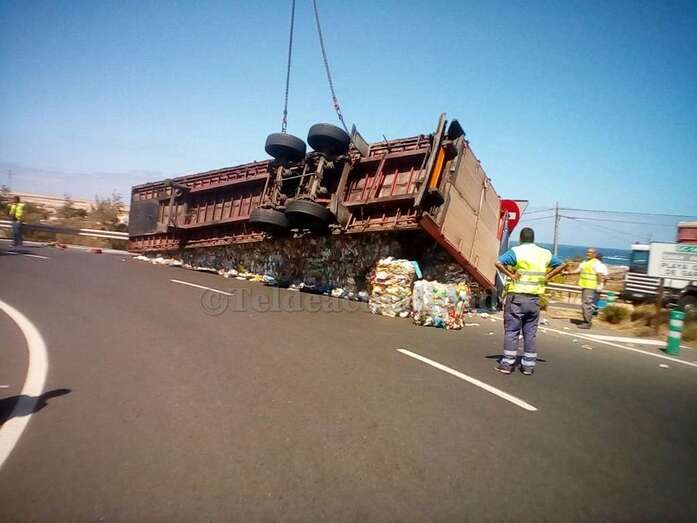 El vehículo, que transportaba material para reciclar, quedó volteado obstruyendo durante varias horas el carril exterior de la glorieta, que tuvo que cerrarse al tráfico. Circunstancia que provocó retenciones significativas en el enlace con la GC-1.
