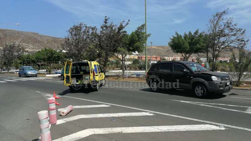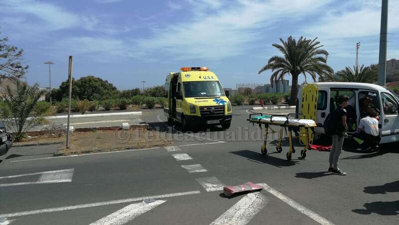 La herida, la acompañante del conductor del vehículo que sufrió el choque lateral, fue atendida por personal de una ambulancia de USE Canaria, que la evacuaría rápidamente al Hospital Insular al presentar una posible fractura de cadera y un traumatismo en el codo del brazo derecho.