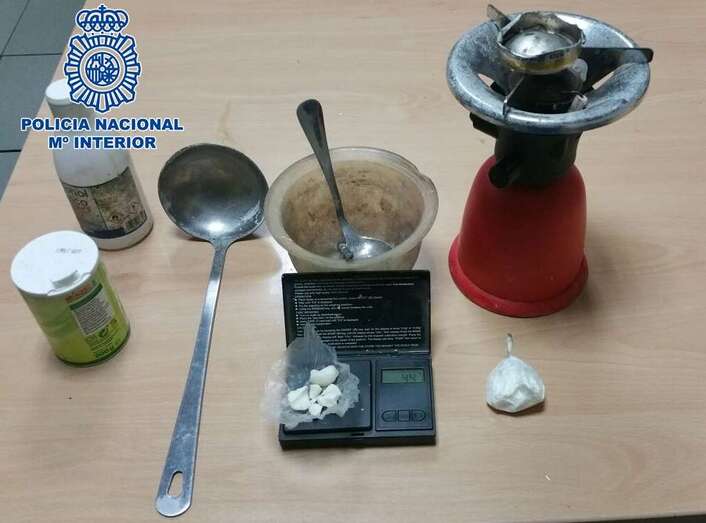Los funcionarios policiales llevaron a cabo un cacheo de seguridad a dos individuos, a quienes les fueron intervenidos 10 gramos de cocaína y 4,3 gramos de crack. En el interior del cuarto trastero fueron localizados además un hornillo, una báscula de precisión y diversas sustancias utilizadas comúnmente para elaborar el crack.