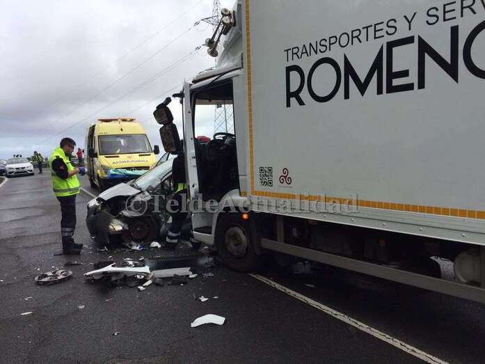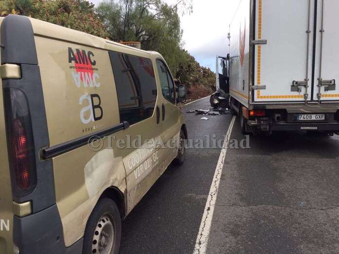 El siniestro ha ocurrido en el tramo de la GC-100 que discurre entre Lomo Cementerio y Cuatro Puertas, en una curva próxima al campo de tiro. Según las primeras informaciones captadas por TELDEACTUALIDAD, el conductor del turismo perdió el control del vehículo al derrapar al tomar en una curva por el firme mojado y se empotró de frente contra el camión que circulaba en sentido contrario.
