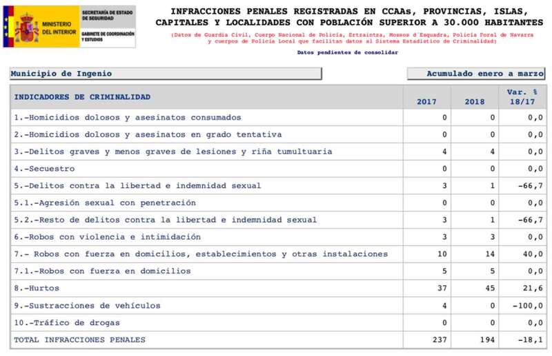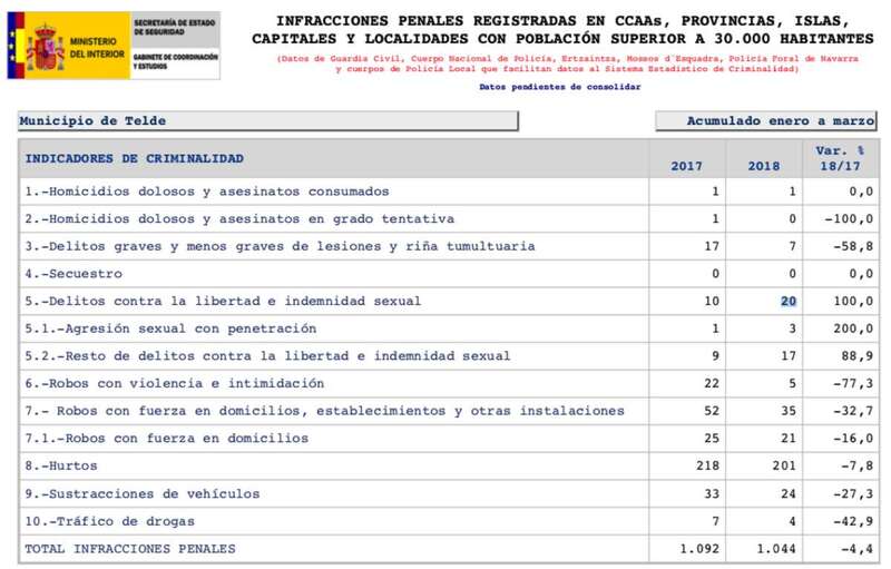 Según se desprende del informe sobre criminalidad, en el acumulado de enero a marzo del presente 2018 se contabilizaron en la ciudad de Telde un total de 1.044 infracciones penales frente a las 1.092 registradas en los mismos meses de 2017, lo que supone un descenso del 4,4 %.