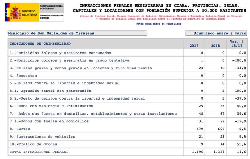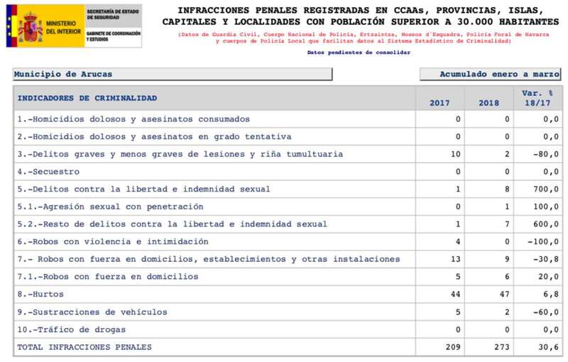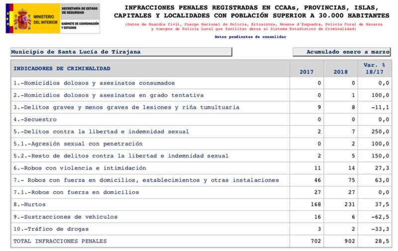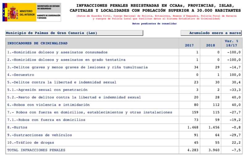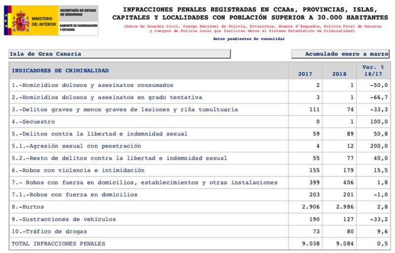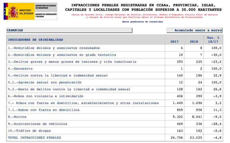 de enero a marzo se registraron en la islas ocho homicidios dolosos o asesinatos consumados (el doble que en 2017, +100 %), siete en grado de tentativa (tres menos, -30 %) y 186 delitos contra la libertad sexual (46 más, +32,9 %).