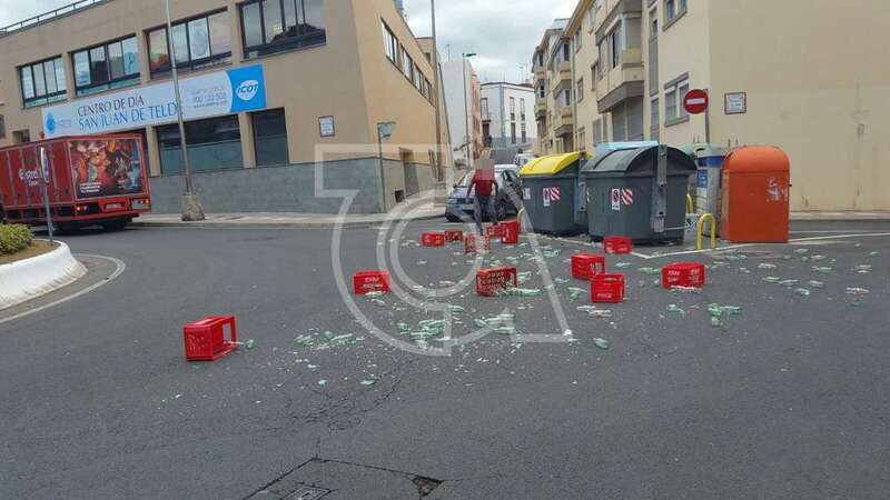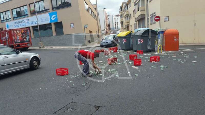Al tomar el giro de la glorieta, parte del cargamento que transportaba, unas doce cajas, salieron despedidas arrojando a la calzada recipientes de vidrio vacíos de refrescos y cerveza.