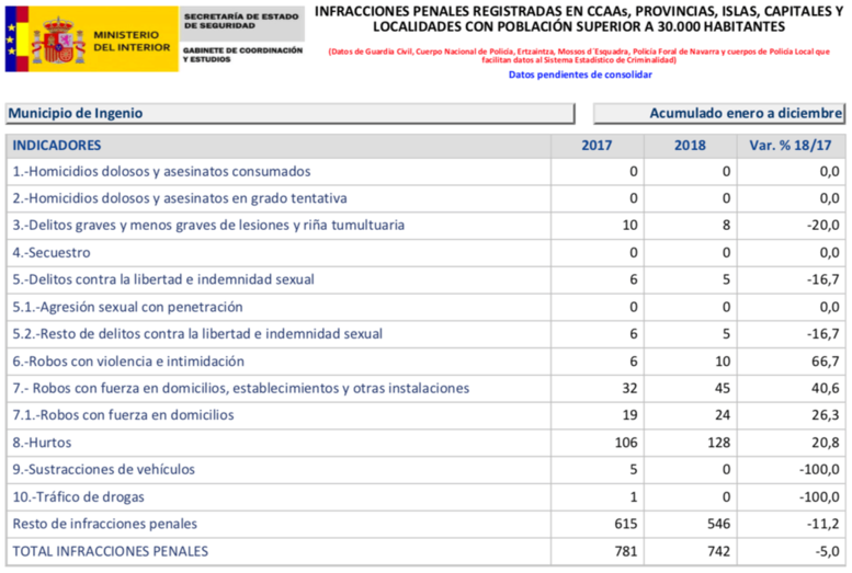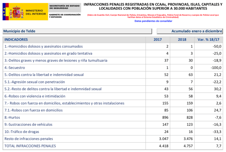 Telde.- La ciudad de Telde cerró el pasado año 2018 con un total de 4.757 infracciones penales, lo que supone 339 (+ 7,7 %) más que las que se cometieron en 2017. Según los datos del balance de criminalidad que el Ministerio del Interior hacía público días atrás, han disminuido los homicidios y asesinatos, así como los delitos relacionados con el tráfico de drogas, al contrario de lo que sucede con los de índole sexual y los robos con fuerza, que experimentan un crecimiento.