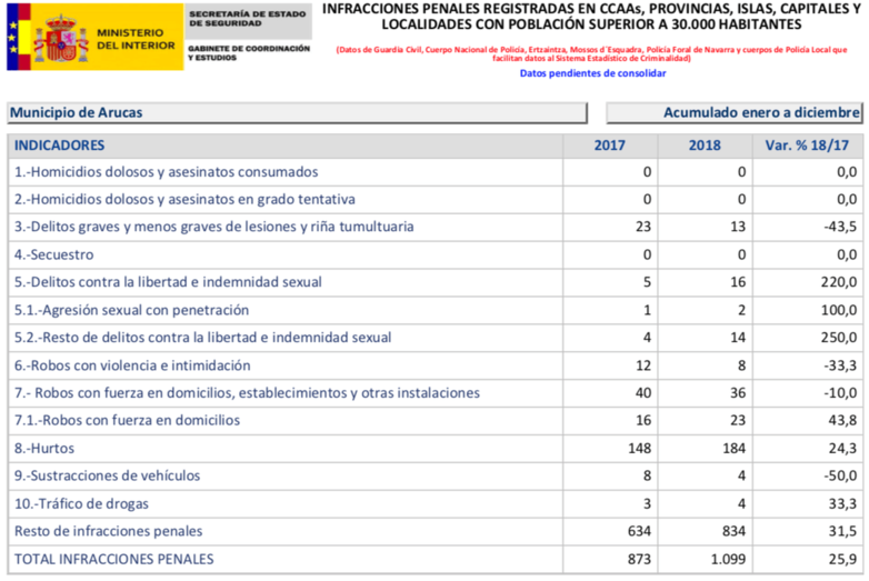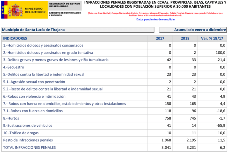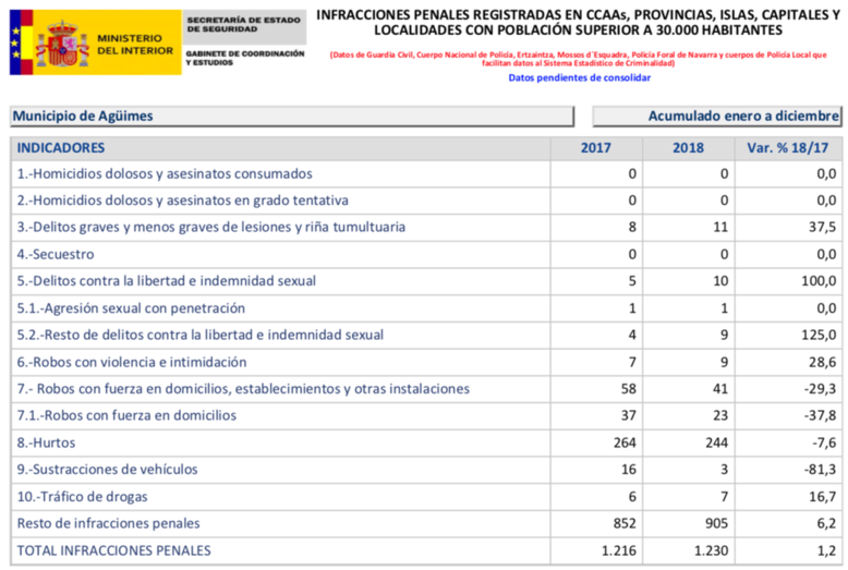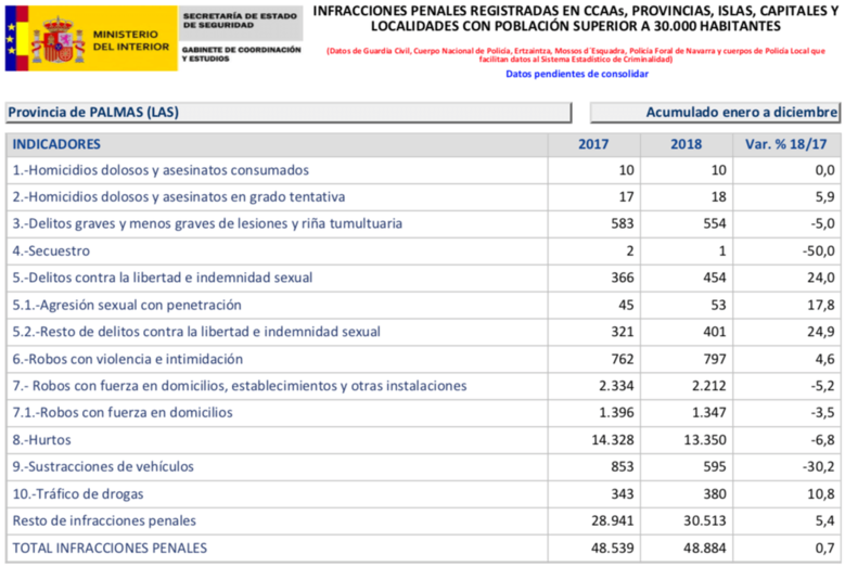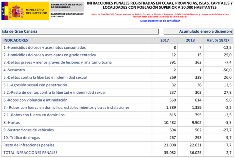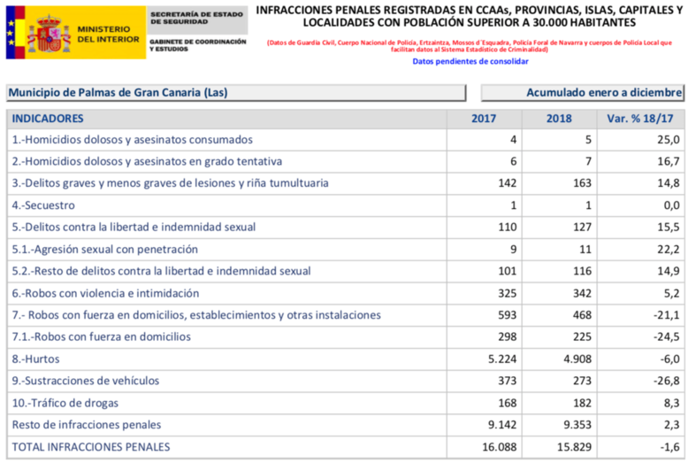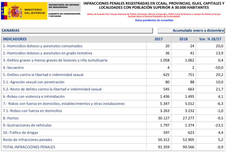Por otro lado, a nivel regional, la Agencia EFE indica que Canarias terminó 2018 con 90.566 infracciones penales denunciadas ante las fuerzas de seguridad, un 0,9 % menos que el año anterior, pero también con un repunte del 20 % de dos de los crímenes más graves: los homicidios y los delitos contra la libertad sexual.