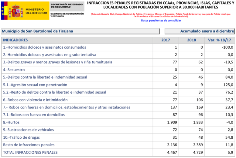 Por islas, el número de infracciones penales disminuyó en 2018 en Lanzarote (- 8,0 %), La Gomera (- 5,0 %) y Tenerife (- 3,0 %) y repuntó en La Palma (6,5 %), El Hierro (6,0 %), Gran Canaria (2,7 %), Fuerteventura (0,3 %).