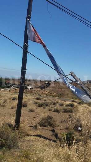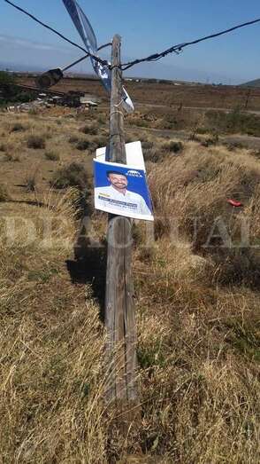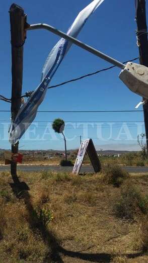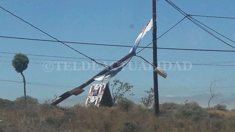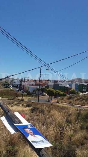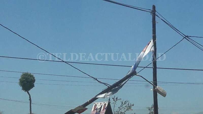 En lo alto del poste, una pancarta electoral ha hecho efecto vela provocando la caída del madero y arrastrando parte del tendido eléctrico.