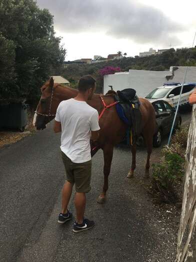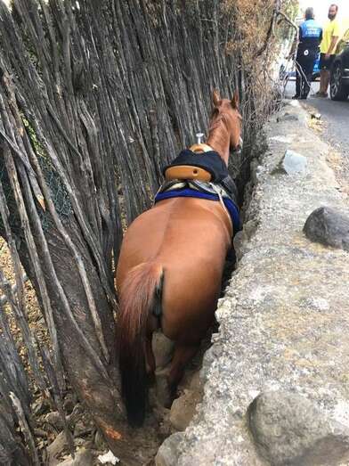 Fue a primera hora de la mañana, sobre las 07.30, cuando la Policía Local de Telde recibió una llamada avisando de que un caballo se encontraba en apuros, tras quedar atorado en un pequeño desnivel en el barranco de San Miguel, junto a una finca, del que no podía salir por sus propios medios.