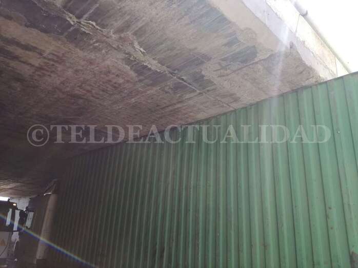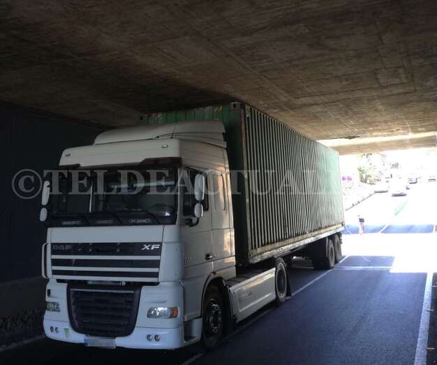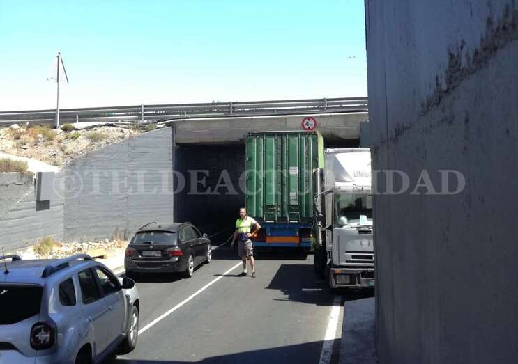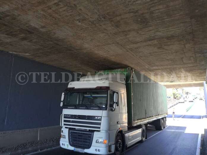El vehículo, un tráiler dedicado al transporte de mercancías, abandonaba el parque empresarial de El Goro con un container enganchado cuando al pasar bajo el viaducto de la GC-1, al final de la calle Bosque, ha quedado encajado bajo la estructura de hormigón, sin poder moverse hacia adelante o marcha atrás.