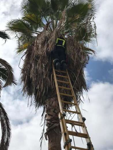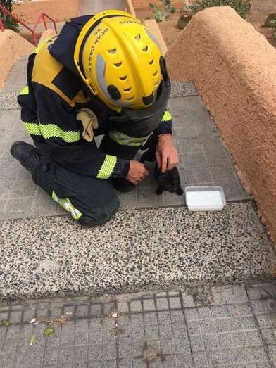 Telde.- Un pequeño gato que se había encaramado a una palmera y no podía bajar fue rescatado este domingo por bomberos del parque zonal de La Garita (Telde).