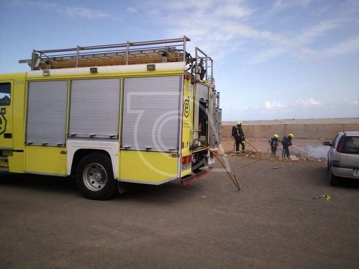 Los efectivos del Consorcio de Emergencias de Gran Canaria emplearon unos 500 litros de agua en extinguir las llamas que prendieron  sobre las 16.30 horas en este material depositado junto a vehículos y viviendas próximas a la calle de Torricelli.