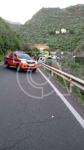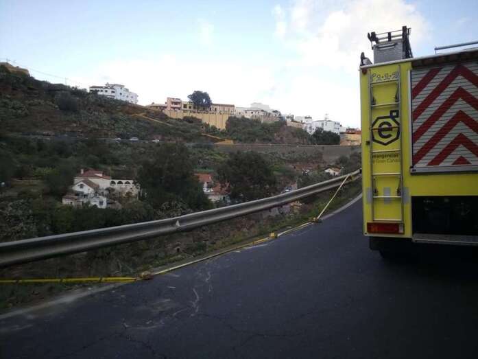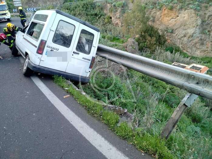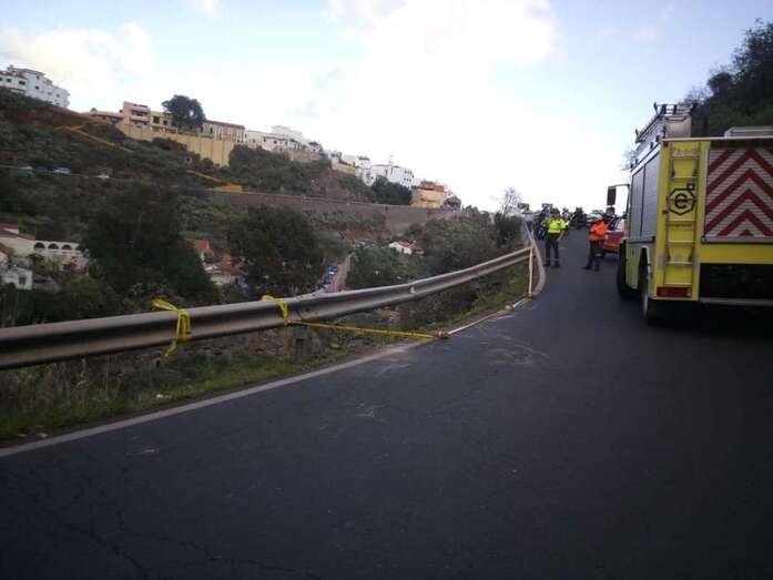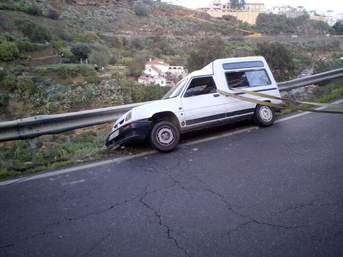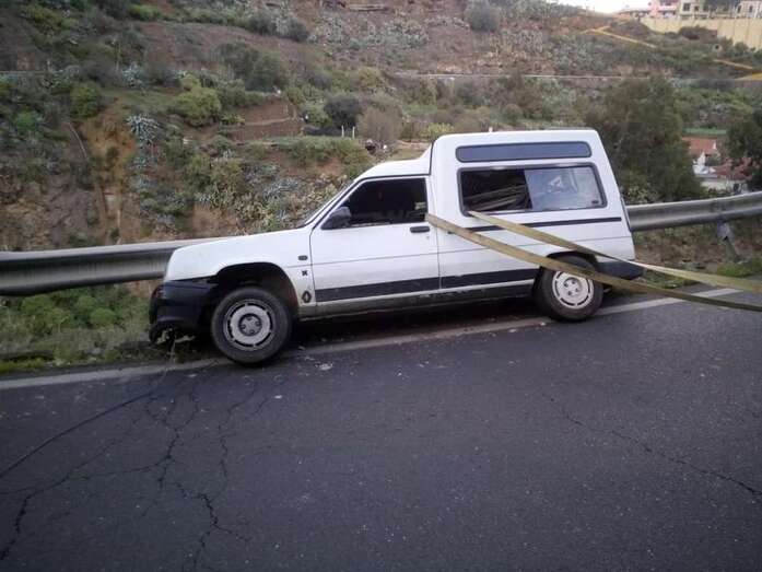 El vehículo chocó con los guardarraíles metálicos cuando marchaba en dirección hacia el casco urbano de Valsequillo y quedó encajonado entre el borde de la vía y el quitamiedos, que le salvó de caer por la pendiente hacia el fondo del Barranco de San Miguel.