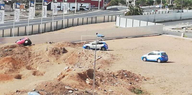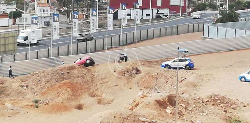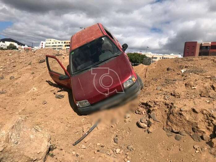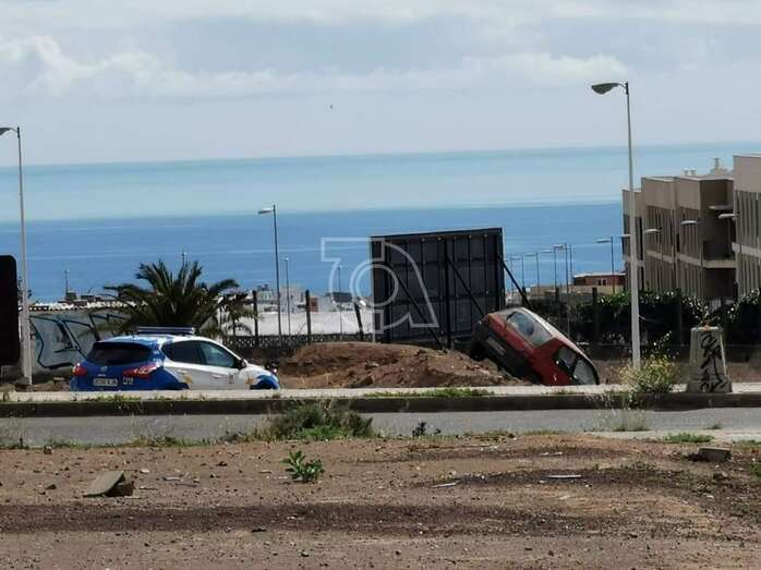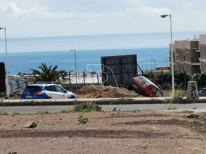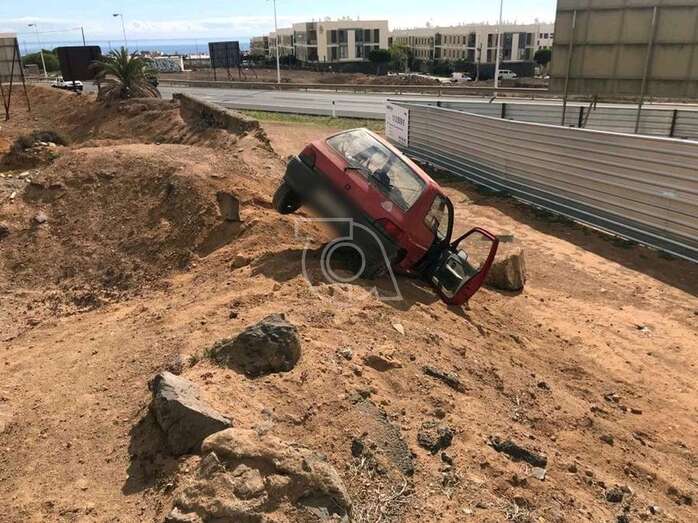 En la confluencia de esta vía con la que baja de Alférez Quintana Suárez rozó un vehículo conducido por una persona mayor y siguió su alocada huida hasta la rambla Pedro Lezcano. Al llegar a ella, giró la izquierda y se metió por un camino de tierra con la intención de conectar con la vía de circulación, pero un terraplén acabó con su peripecia.