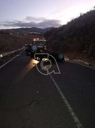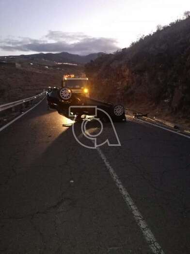 Telde.- Un vehículo volcó esta noche en la carretera de Los Picos, que sube de Telde a Lomo Magullo, a la altura de Llano Madrid. Los dos ocupantes fueron evacuados en ambulancia del SUC al Hospital Insular.