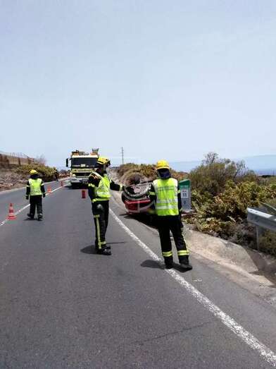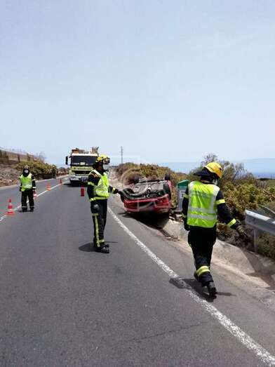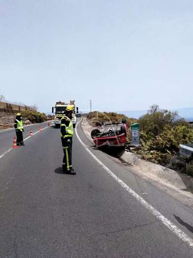 Efectivos del parque zonal de bomberos de Telde hicieron acto de presencia para enderezar el vehículo que quedó en la cuneta con el chasis hacia arriba. También intervino la Guardia Civil de Tráfico, que se encargó de instruir las diligencias del suceso ocurrido a primera hora de la tarde de este sábado..