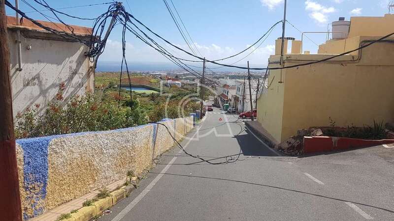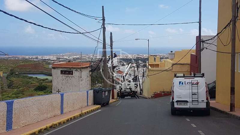 Un camión arranca los cables del tendido eléctrico y de Telefónica en una calle de Caserones Bajos (Telde)