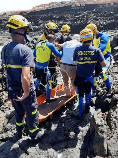 Bomberos del parque zonal de Telde trasladaron en una camilla al afectado desde los riscos al punto donde se encontraba la unidad móvil del Servicio de Urgencia Canario, cuyo personal lo atendió de sus lesiones.