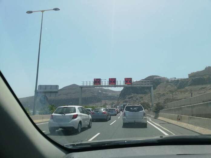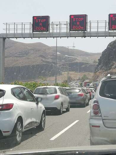 La cola de vehículas ha obligado a cerrar el túnel de La Laja al tráfico, según han confirmado varios conductores a TELDEACTUALIDAD. Sin embargo, los curiosos que circulaban en sentido norte y que reducían velocidad a la altura del incidente para ver qué ocurría, acabaron por generar otro atasco que, a las 15:30 horas ya alcanzaba el aeropuerto.