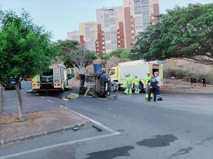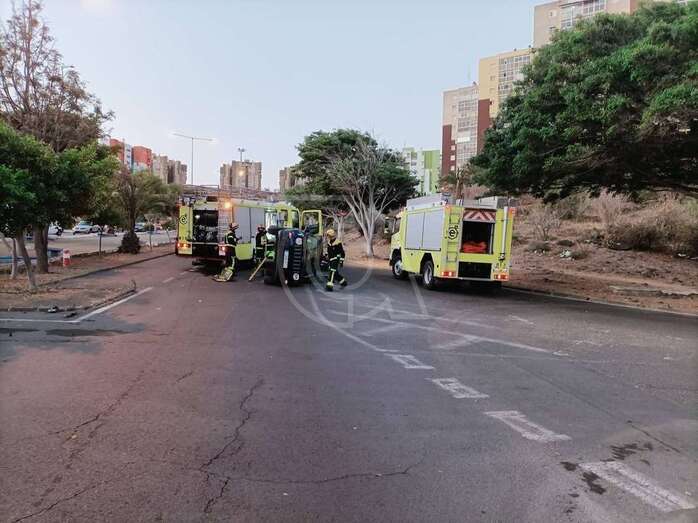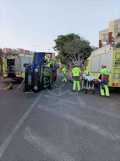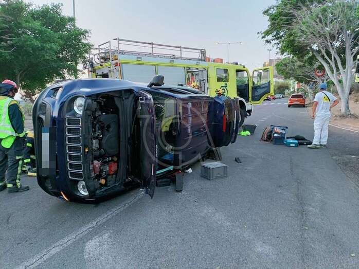 Un vehículo volcó a primera hora de esta mañana en la rambla de La Concepción, en el Valle de Jinámar, tras recibir la embestida de otro. El conductor que atrapado en su interior y fue sacado por los bomberos. Sufrió lesiones de carácter leve.