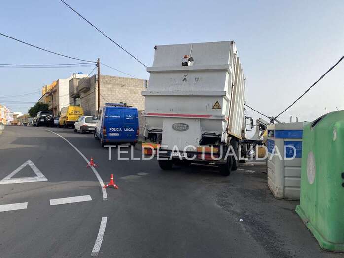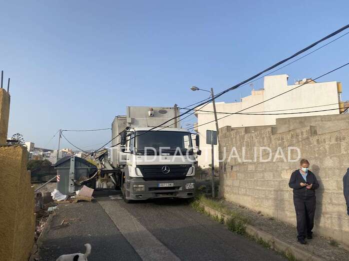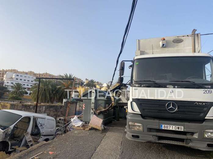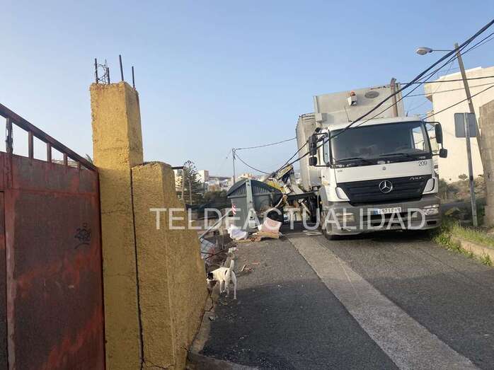 Un camión del servicio municipal de Limpieza de Telde sufrió un accidente este lunes, a primera hora de la mañana, en el barrio de La Herradura. El vehículo, al descargar un contenedor, golpeó un muro derribando además un poste del tendido eléctrico.
