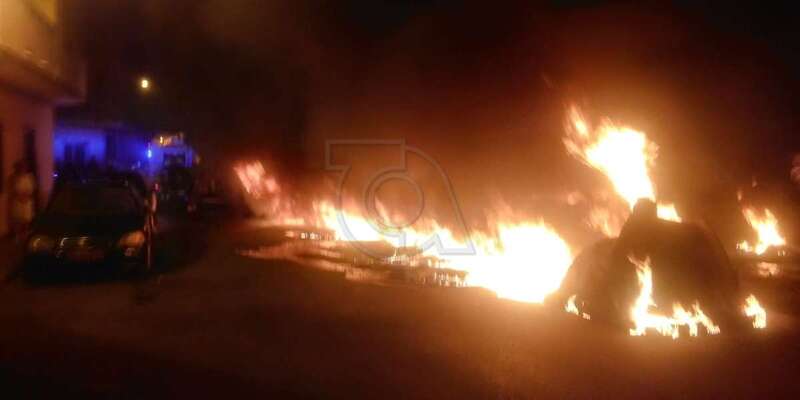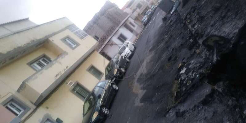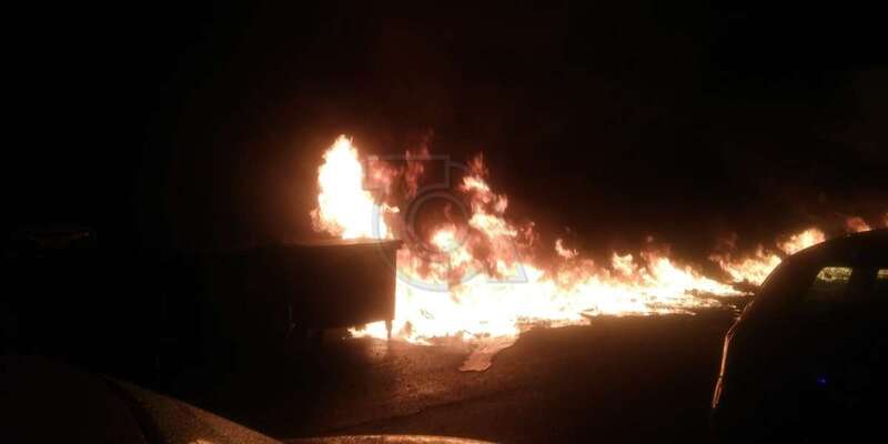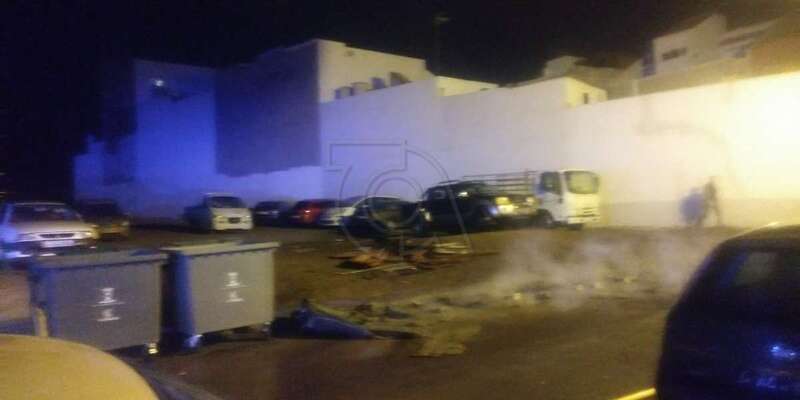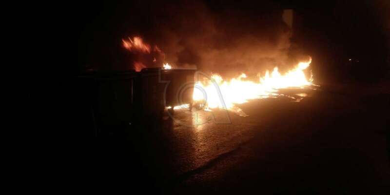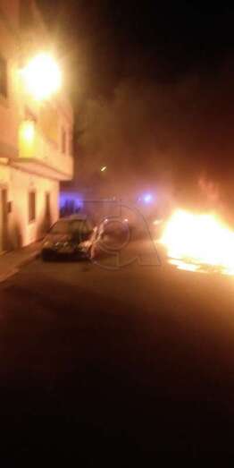 Un pavoroso incendio intencionado calcinó a primera hora de esta mañana casi una decena de contenedores en la calle de Sagunto, en el barrio teldense de Las Huesas.