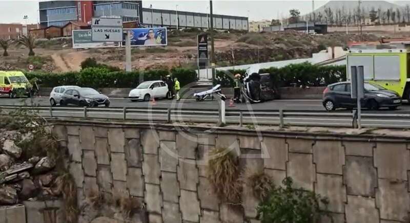 Varios vehículos se han visto implicados en un accidente de tráfico que ha tenido lugar este sábado en la GC-1 a su paso por Telde, a la altura del barrio de Las Huesas y en sentido hacia la capital grancanaria. Uno de ellos ha volcado.