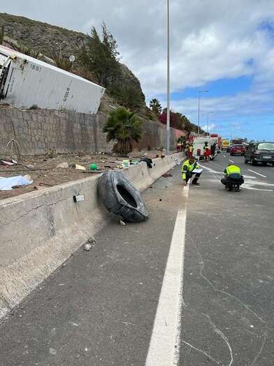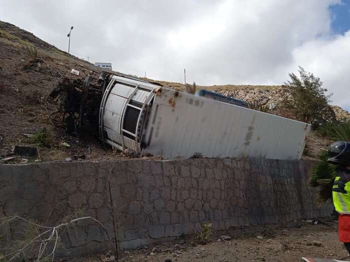 Grave accidente de tráfico en la GC-1 en las inmediaciones del túnel de La Laja, en Las Palmas de Gran Canaria. Un camión que circulaba en dirección hacia Telde se salió de la carretera y se precipitó ladera abajo, invadiendo parte del carril izquierdo en sentido contrario.