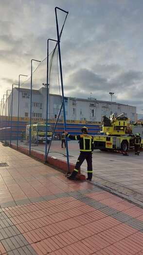 La Concejalía de Actividad Física y Deportes, que dirige Diego Ojeda, activó en la tarde de este viernes a los servicios de emergencias ante el riesgo de caída de un poste del vallado sur de la cancha de Marpequeña.