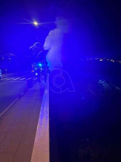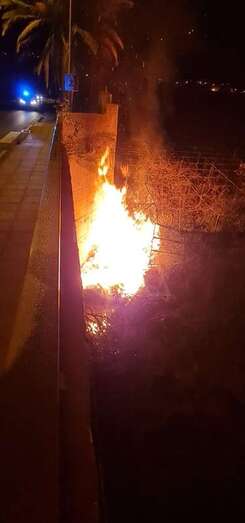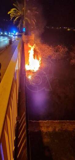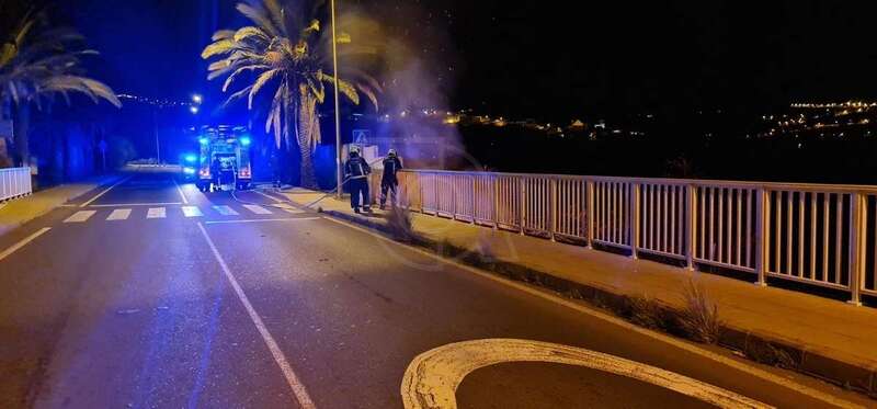 Incendio de rastrojos y hierbas debajo del puente sobre el Barranco Real de Telde próximo al parque Pinocho