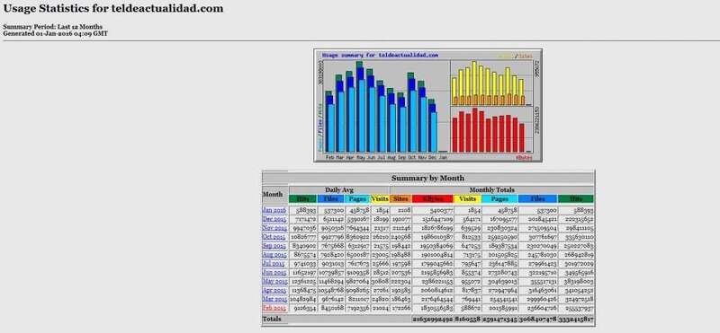 Por otro lado, la estadística Webalizer, propia del servidor donde está alojada la web de este diario digital, arroja para 2015 más de 3.300 millones de acceso, exactamente 3.332 millones. Se entiende por accesos la descarga de todos los elementos de una página (textos, fotografías, etcétera) cuando se accede a ella. No se puede confundir con visitas. Los hits carecen de valor alguno para las agencias de publicidad. (Ver cuadro estadístico)