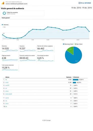 Los registros estadísticos de Google Analytics, que certifica los datos, indican que TELDEACTUALIDAD recibió 66. 462 visitas a sus páginas y 14.520 sesiones, desde 9.237 ordenadores distintos (usuarios únicos) que tuvieron conectados a este diario digital durante 3,43 minutos de promedio en cada acceso.