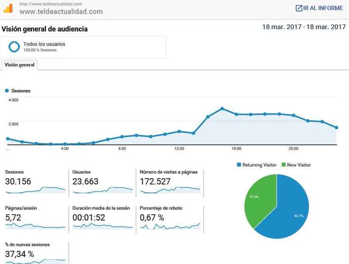 Telde.- TELDEACTUALIDAD computó durante este fin de semana (sábado y domingo) casi 300.000 páginas vistas, de las que 172.527 fueron visualizadas durante la jornada del pasado sábado, 18 de marzo.